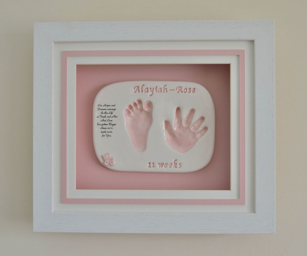 The ceramic prints product consists of a tile with prints that are pressed into the surface of the tile. They are a classic look as far as keepsakes go. If you were looking to have something a bit more contemporary or 3 dimensional, then please browse through the raised outprints or 3D casting range.